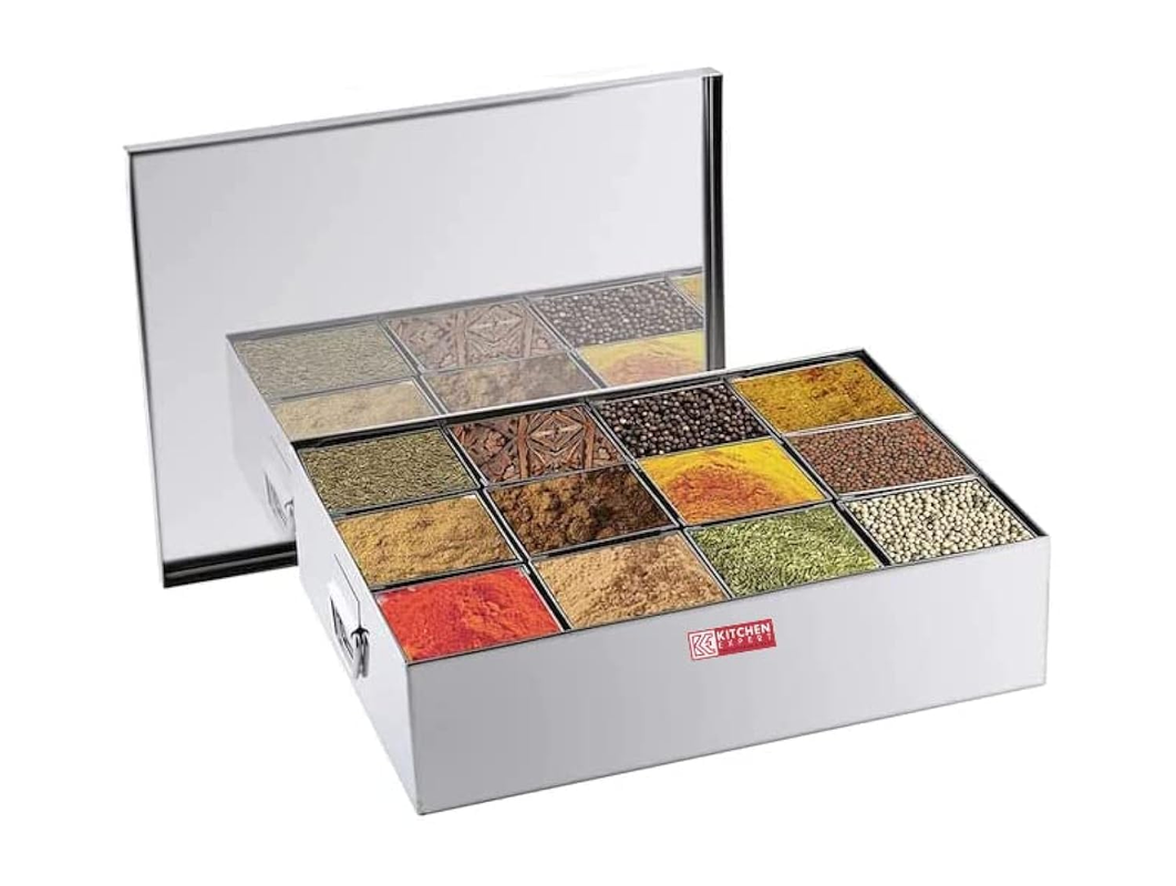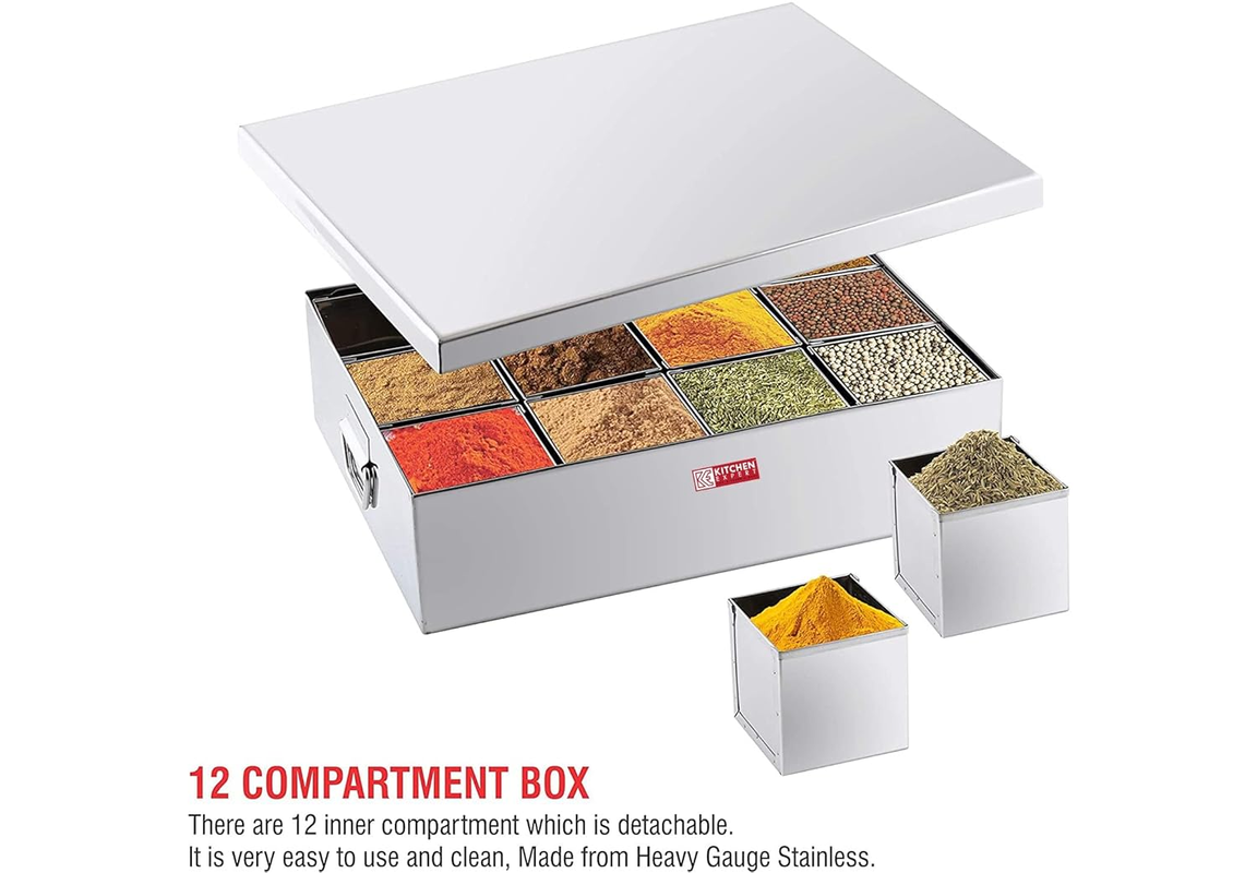 New Kitchen Expert jumbo spice masala box commercial stainless steel canister for masala.It consists of twelve separate removable Stainless-Steel cups and small utility spoon. This flat Masala Box / Dabba is rust proof and hygienic.Made from 100% Food Grade stainless steel making it highly durable and resistance to corrosion.Ideal product…